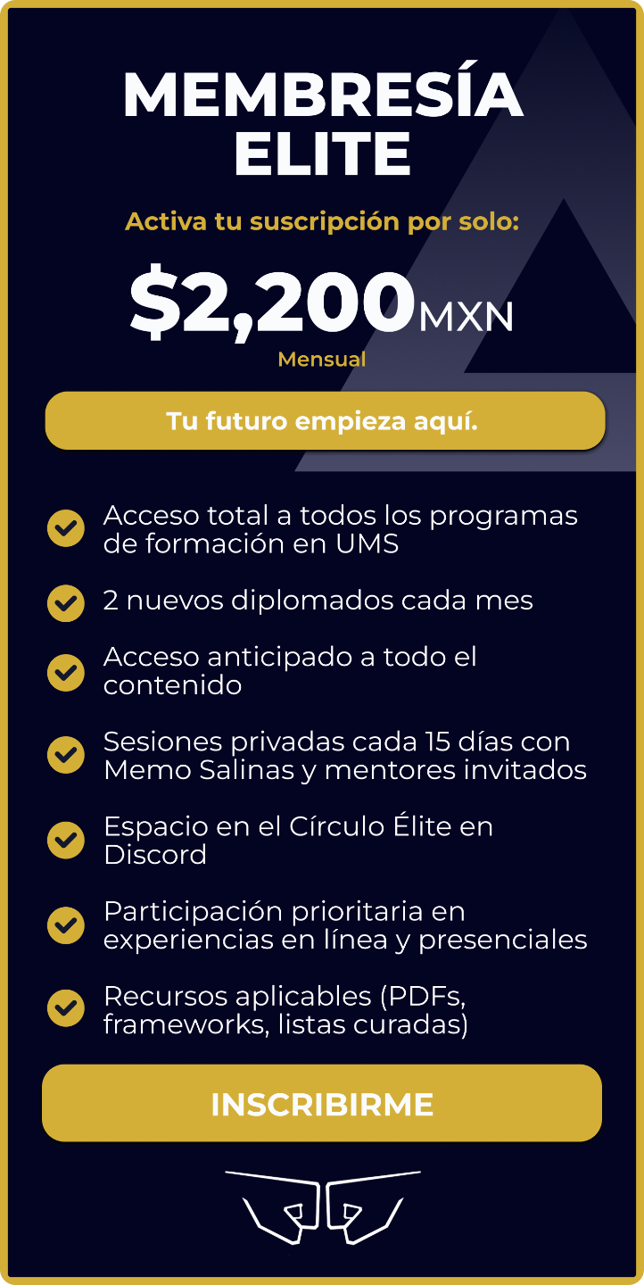 Membresía Elite: para quienes buscan rodearse de una comunidad que ya está construyendo su futuro, con mentorías directas y ventajas estratégicas.