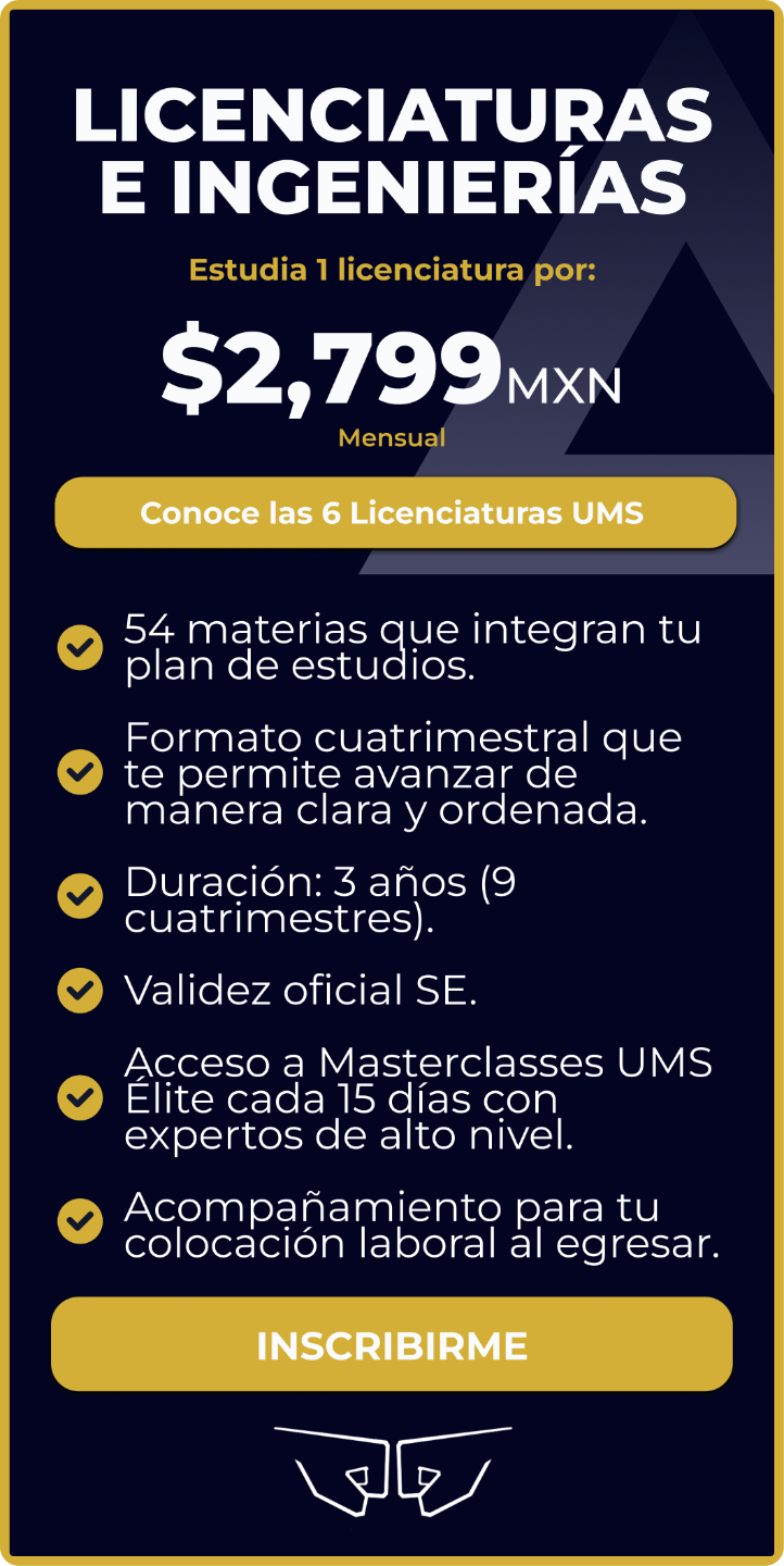 Universidad MS tiene todos los programas académicos oficialmente reconocidos y más adaptados a las necesidades reales para llegar a ser una persona verdaderamente exitosa en el mundo actual. Al inscribirte, además de cursar tu licenciatura/ingeniería, tendrás acceso exclusivo a las Masterclasses de la Membresía Élite UMS, con Memo Salinas y expertos invitados en vivo, que se impartirán cada 15 días para complementar tu aprendizaje y tu preparación profesional con temas de actualidad, liderazgo y negocios.