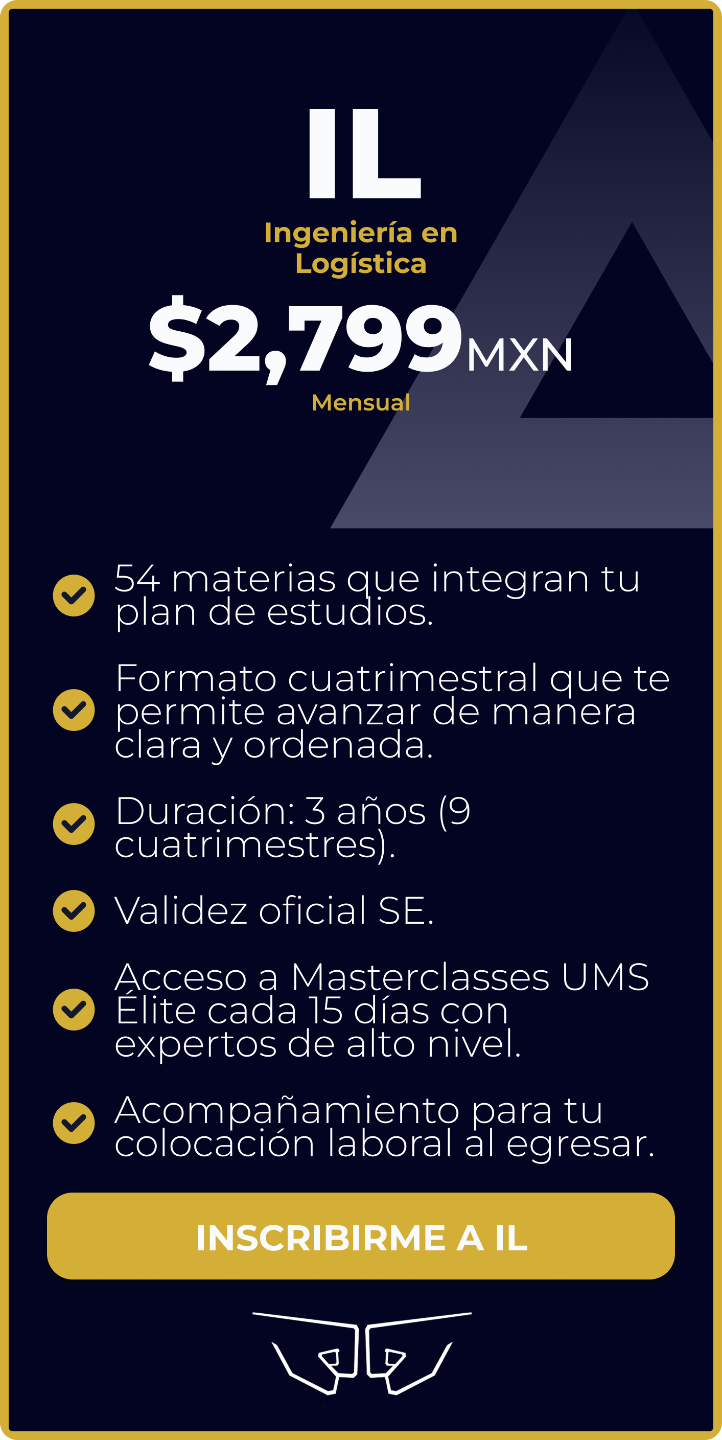 La Ingeniería en Logística de UMS te prepara para optimizar procesos, gestionar inventarios y coordinar la distribución de materiales en un entorno global altamente competitivo.