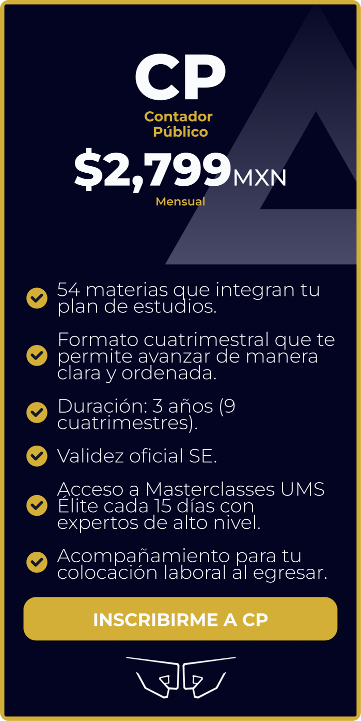 Estudiar Contador Público en UMS te preparará para generar, analizar y optimizar información financiera, cumplir con obligaciones fiscales y tomar decisiones estratégicas que aporten valor a las organizaciones.